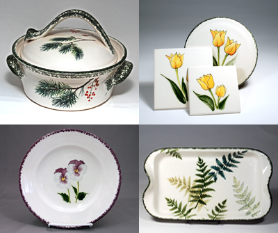 Pine Ridge Studio pottery is made out of stoneware. This means it is strong, durable, and ready for years of use. It is completely hand-made. Most pieces are thrown on the potter’s wheel while others are created using clay slabs shaped by hand over plaster molds. All the glazes used are formulated and mixed at the Studio, and all the decorations are done by hand using a combination of sponging, stencils and free hand brush work.